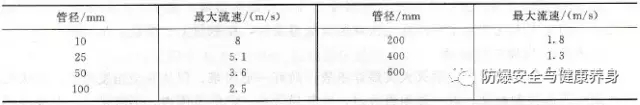 a.限制输送速度,降低物料移动中的摩擦速度或液体物料在管道中的流速等工作参数,可限制静电产生,对液体物料来说,控制流速是减少静电电荷产生的有效办法。为了不影响生产,将最大允许流速定为安全流速,使物料在输送中不超过安全流速的规定。不同管径的允许最大流速见表4-6。表4-6的规定是指单一品种纯净产品正常时在管道内的流动速度。当处于特殊情况时,应按表4-7中的规定。